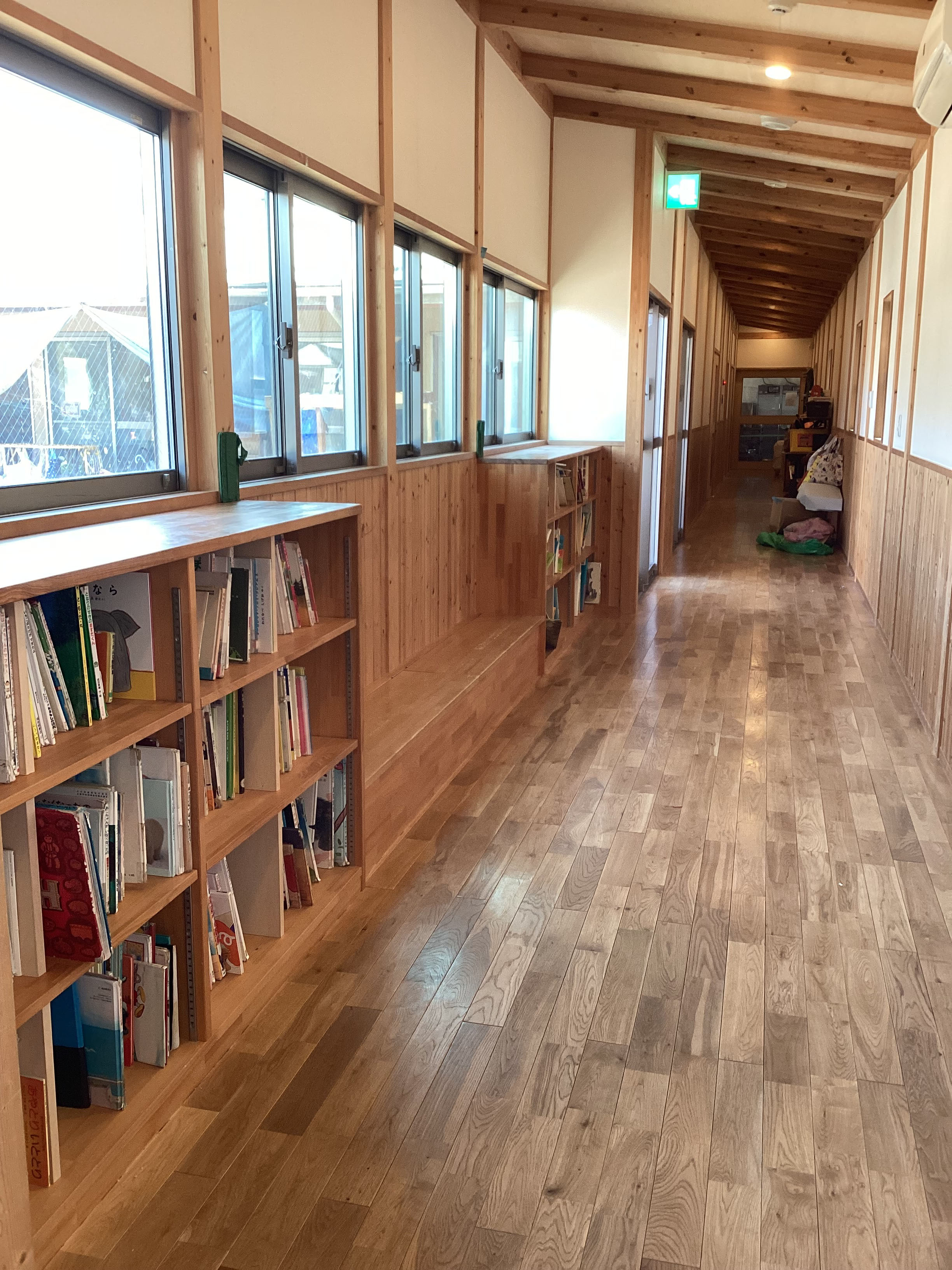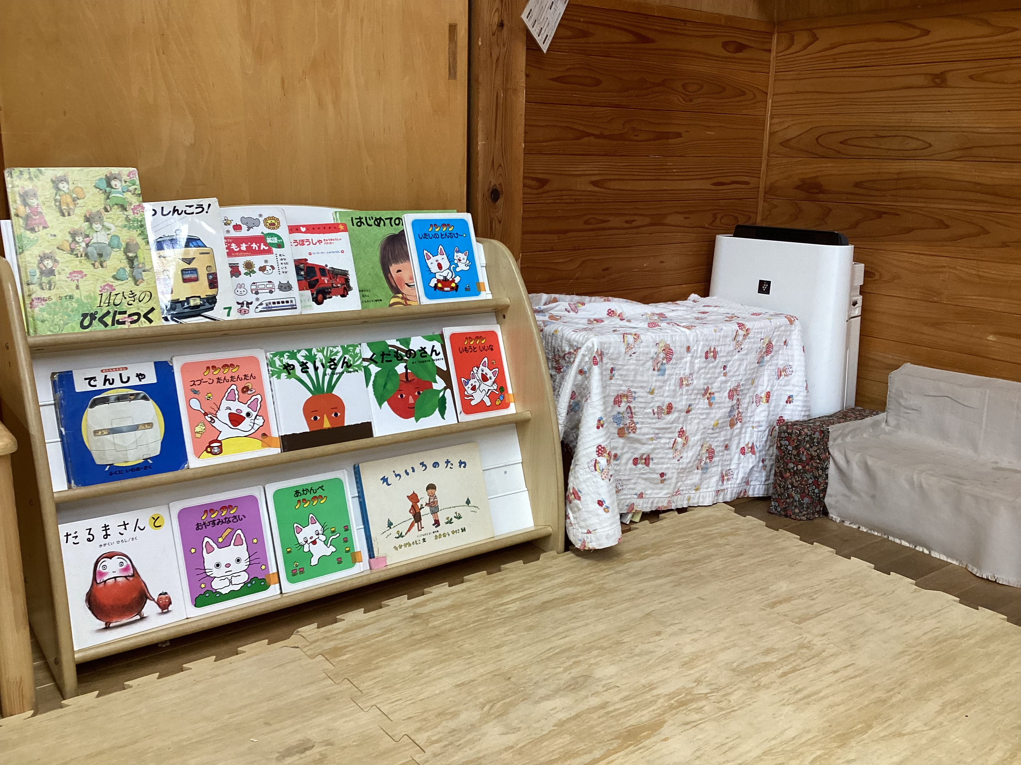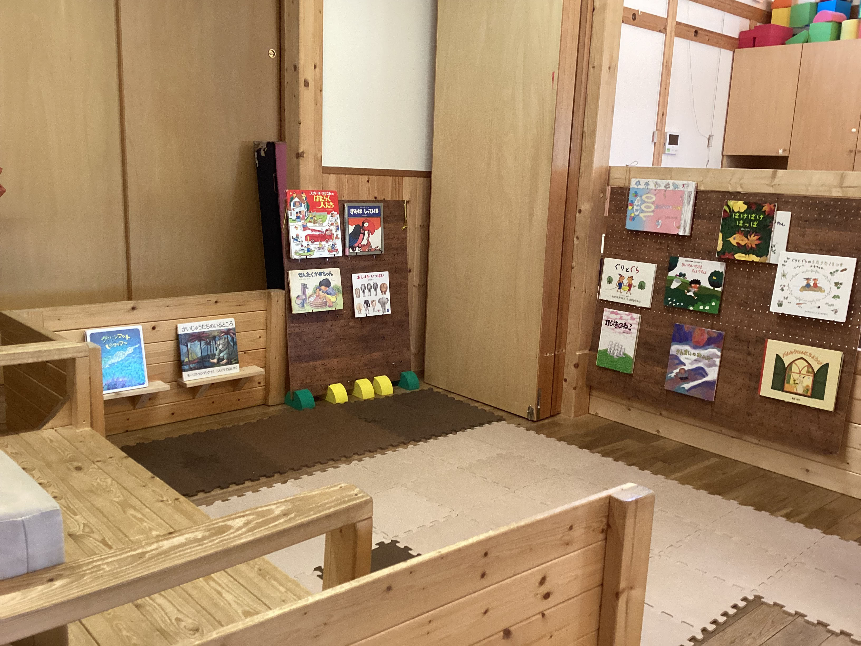 年長児が図書館で本を借りてその時々の旬な本が並びます。